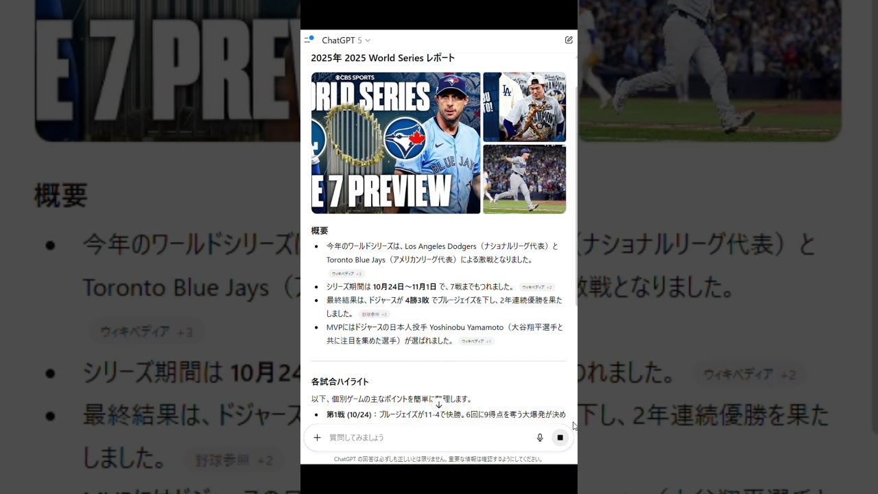 【ほぼテク ショート】ChatGPTで話題のスポーツ速報を一発レポート!〜2025年ワールドシリーズ結果をAIで即まとめ〜 AIをフル活用して業務効率化 X Facebook はてブ LINE コピー 2025.11.13